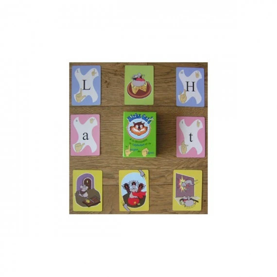 – 90 cartes (26 cartes majuscules, 53 cartes minuscules, 11 cartes Action (sur chaque carte figure une lettre et la position de la main correspondante en Langage des Signes Français)