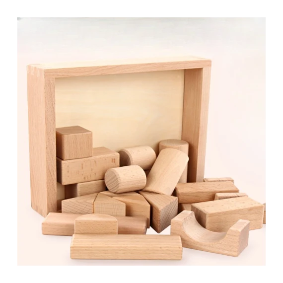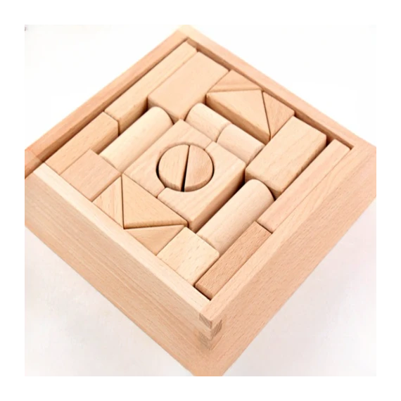 Ce jeu de construction en bois propose 35 blocs en bois naturel, de formes géométriques différentes (carrés, rectangles, cylindres et triangles).