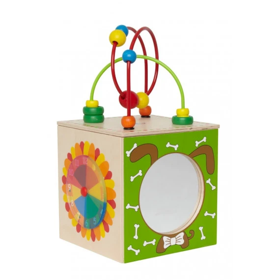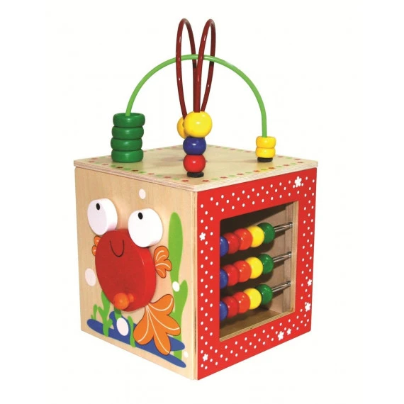 Sur les cinq faces de ce grand cube d’activités en bois, le tout jeune enfant trouvera plusieurs jeux d’éveil : boulier-abaque pour une première rencontre avec le comptage, roue des couleurs pour la reconnaissance des formes et des couleurs, miroir pour admirer son reflet, labyrinthe à perles pour exercer sa motricité fine et la coordination oeil/main, yeux mobiles du poisson pour un éveil du sens visuel et de la manipulation…