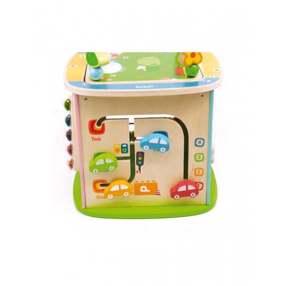 Une activité de motricité fine, sur l’une des faces du cube d’activités, lui propose un jeu de labyrinthe dans lequel il prendra plaisir à faire circuler de petits voitures en bois aux jolies couleurs pastel.
