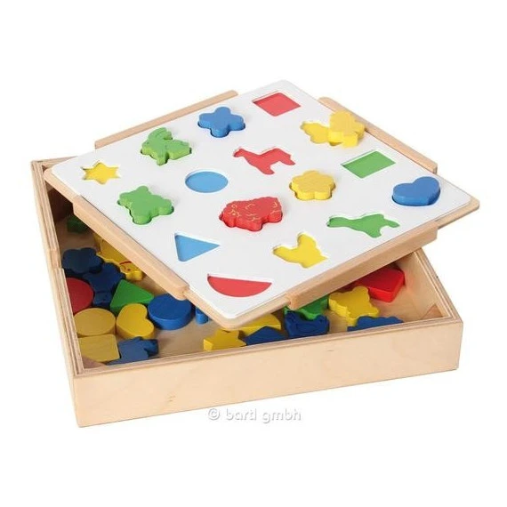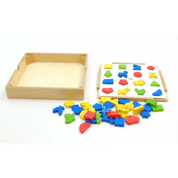 Le jeune enfant est invité à placer correctement des formes en bois sur un plateau où sont présentés 16 encastrements. 48 pièces sont à sa disposition : 16 pièces de formes différentes (des animaux, fleur, cœur, formes géométriques, étoile) et couleurs différentes (couleurs primaires). Au total, 48 pièces sont disponibles dans ce jeu.