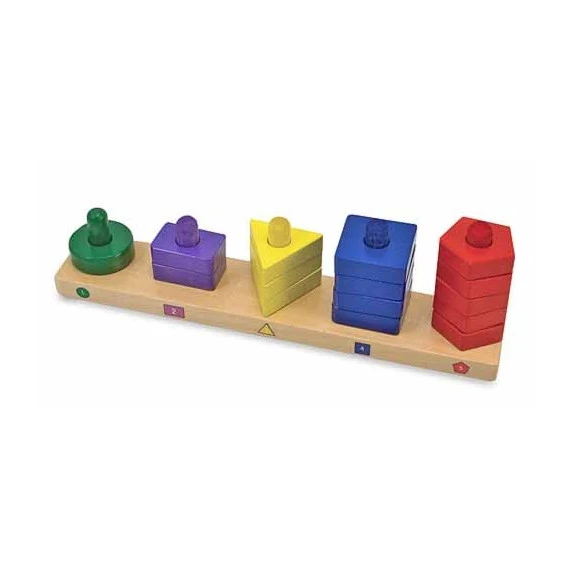 Ce jeu d’éveil en bois invite l’enfant dès 18/24 mois à trier les pièces et les enfiler sur des tiges selon leurs formes, leurs couleurs mais aussi en correspondance avec le nombre indiqué sur le support (l’enfant est donc amené à dénombrer les pièces qu’il empile).