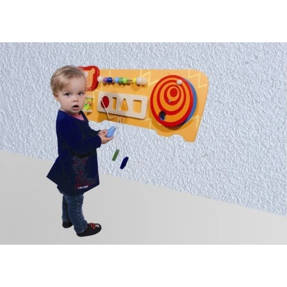 Ce grand et long jeu mural en bois de couleur orange, représentant un lion, propose 4 jeux d’éveil aux mois.