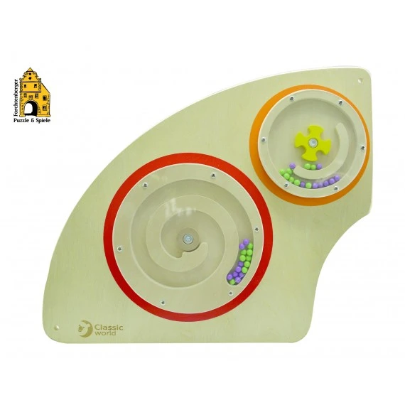 – une activité de labyrinthe de perles (l’enfant prendra plaisir à faire tourner les deux roues afin de guider les multiples petites perles à travers le labyrinthe),