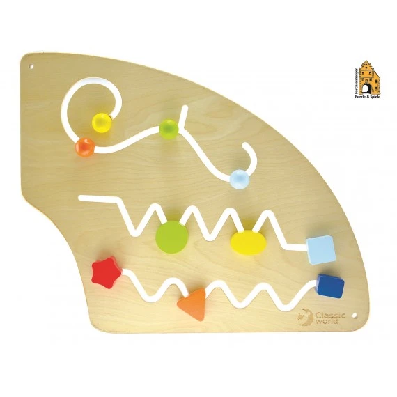 – une activité de motricité fine : l’enfant s’amusera à déplacer les formes en bois coloré le long des trois tracés différents, exerçant ainsi son poignet pour des activités de graphisme et d’écriture ultérieures.