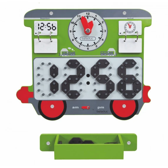 Ce grand jeu mural en forme de wagon de train propose aux enfants diverses activités autour du thème de l’heure. Dès 6 ans (pour l’activité Horloge), dès 3 ans pour l’activité avec les dominos noirs.