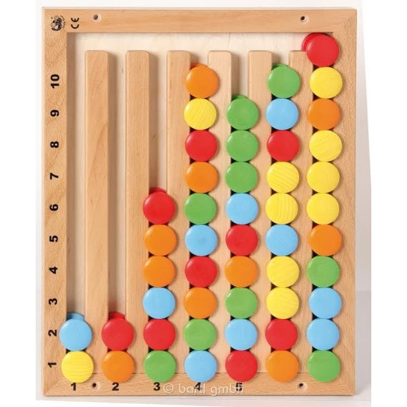 Ce jeu mural en bois va aussi favoriser le sens de la logique et de l’observation de l’enfant. En effet, il lui propose de reproduire des configurations de pions de couleurs variées. Ce peut être une ligne de trois pions jaunes et de cinq pions bleus, puis une ligne de deux pions rouges et de quatre pions verts…