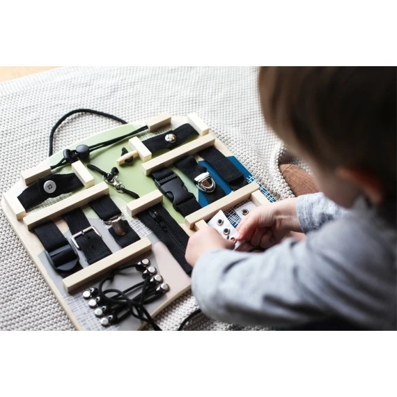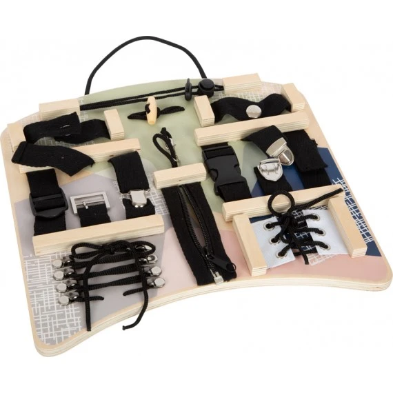 Cette planche de motricité en bois, d’inspiration Montessori, propose différentes fermetures et fixations (cordon coulissant, bouton traditionnel, bouton-pression, boucle de ceinture, pince de bretelle, mousqueton, fermoir de sac, fermeture à clic, fermeture éclair et fermeture velcro, lacets à enfiler et à boucler).