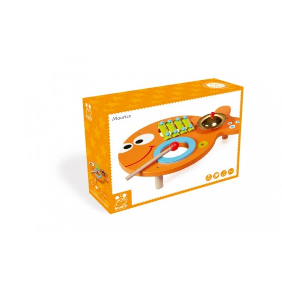 Ce superbe poisson musical de bonne dimension est un instrument de musique 3 en 1 : il réunit en effet un tambour transparent, un xylophone à 4 notes et une cymbale (sans oublier bien sûr la baguette en bois pour laquelle un support de rangement bien pratique est prévu).